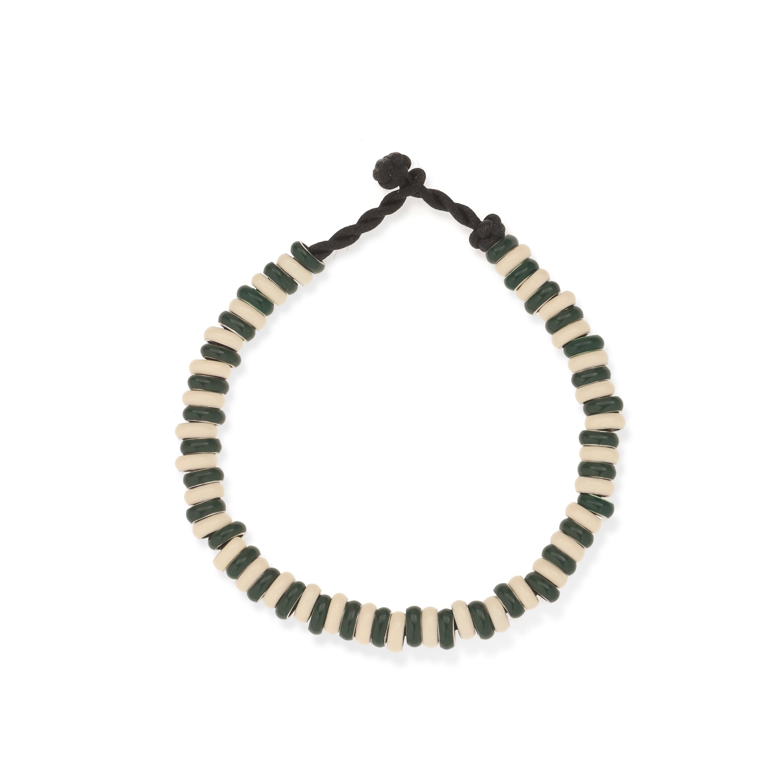Enamel-wrapped sterling silver beads in forest green and white. A striped bracelet on satin cord—perfect stacked with your favorite chain styles.